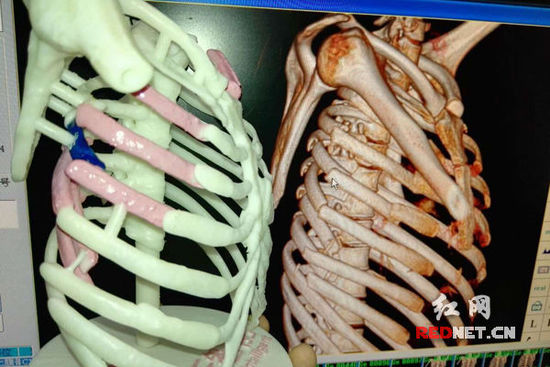 電焊工被重達數(shù)百公斤的鋼柱打中,造成7根肋骨骨折,每根肋骨斷成數(shù)截。湖南省人民醫(yī)院心胸外科采用3D打印技術確定骨折部位、明確手術切口,最終成功施行手術。國內(nèi)外文獻查新顯示:“未見3D打印技術運用于肋骨骨折手術的報