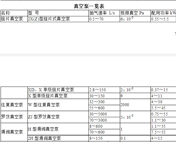 初步選定了泵的類型之后,對于真空泵,還要根據(jù)系統(tǒng)所需的氣量來選用泵的型號。 關(guān)于真空泵的抽速選擇及抽氣時(shí)間計(jì)算可參照我公司網(wǎng)頁面對各種型式的水環(huán)式真空泵及壓縮機(jī),我們特將其各自特點(diǎn)收集如下,以利于用戶選型 代號 主要特點(diǎn) 極限真空度 mmHg 工作真空度 mmHg 抽速范圍 m3/min 密封形式